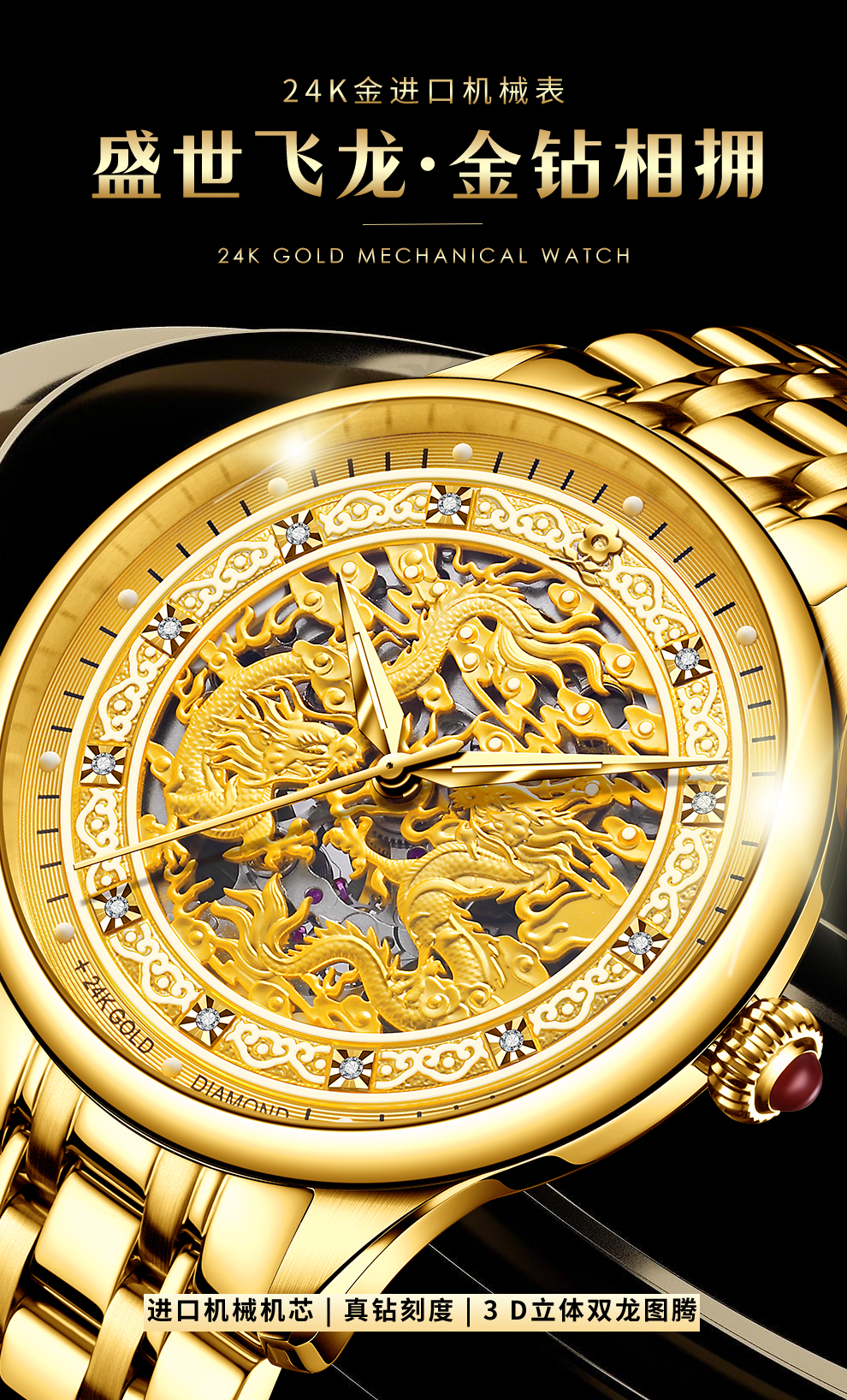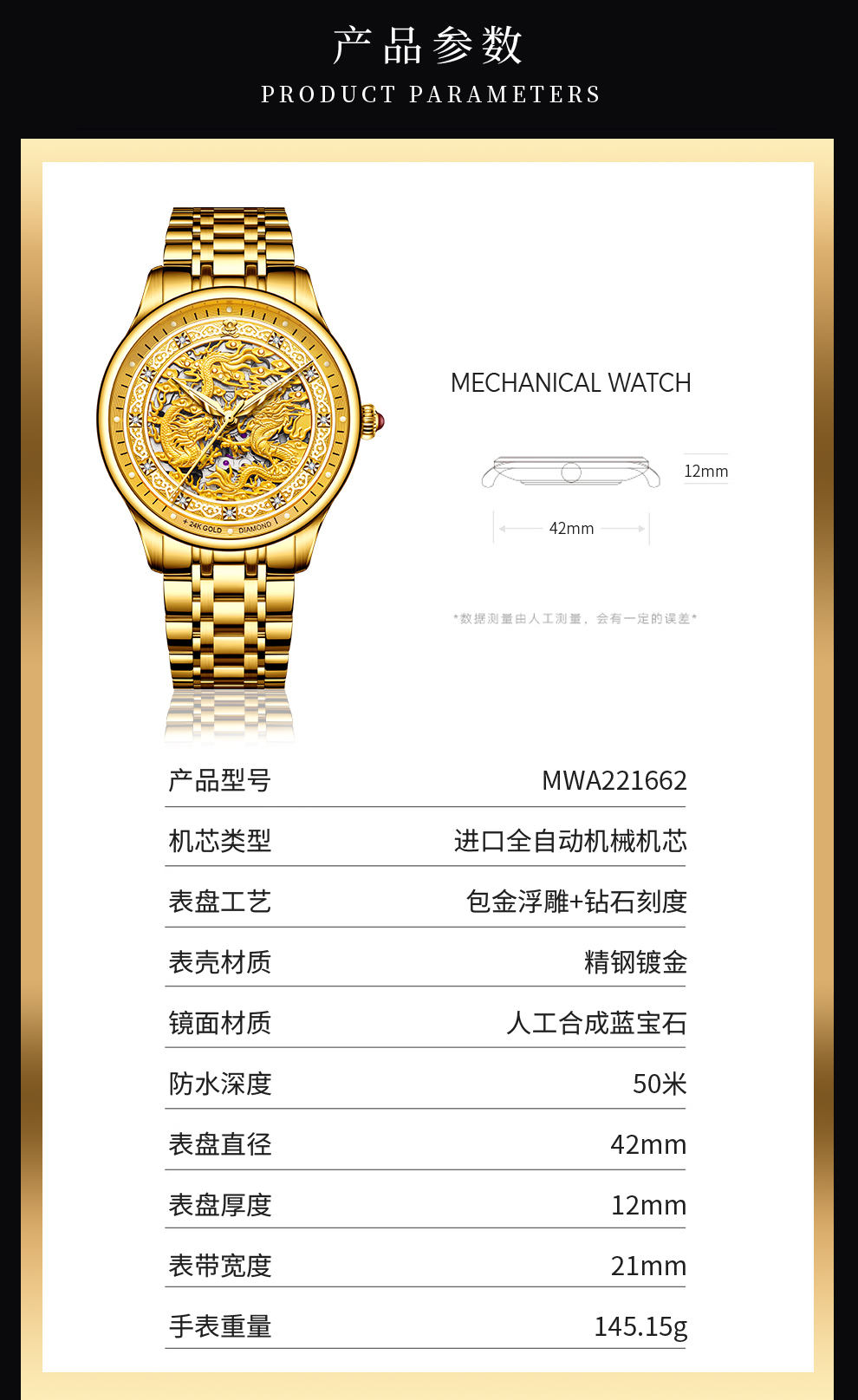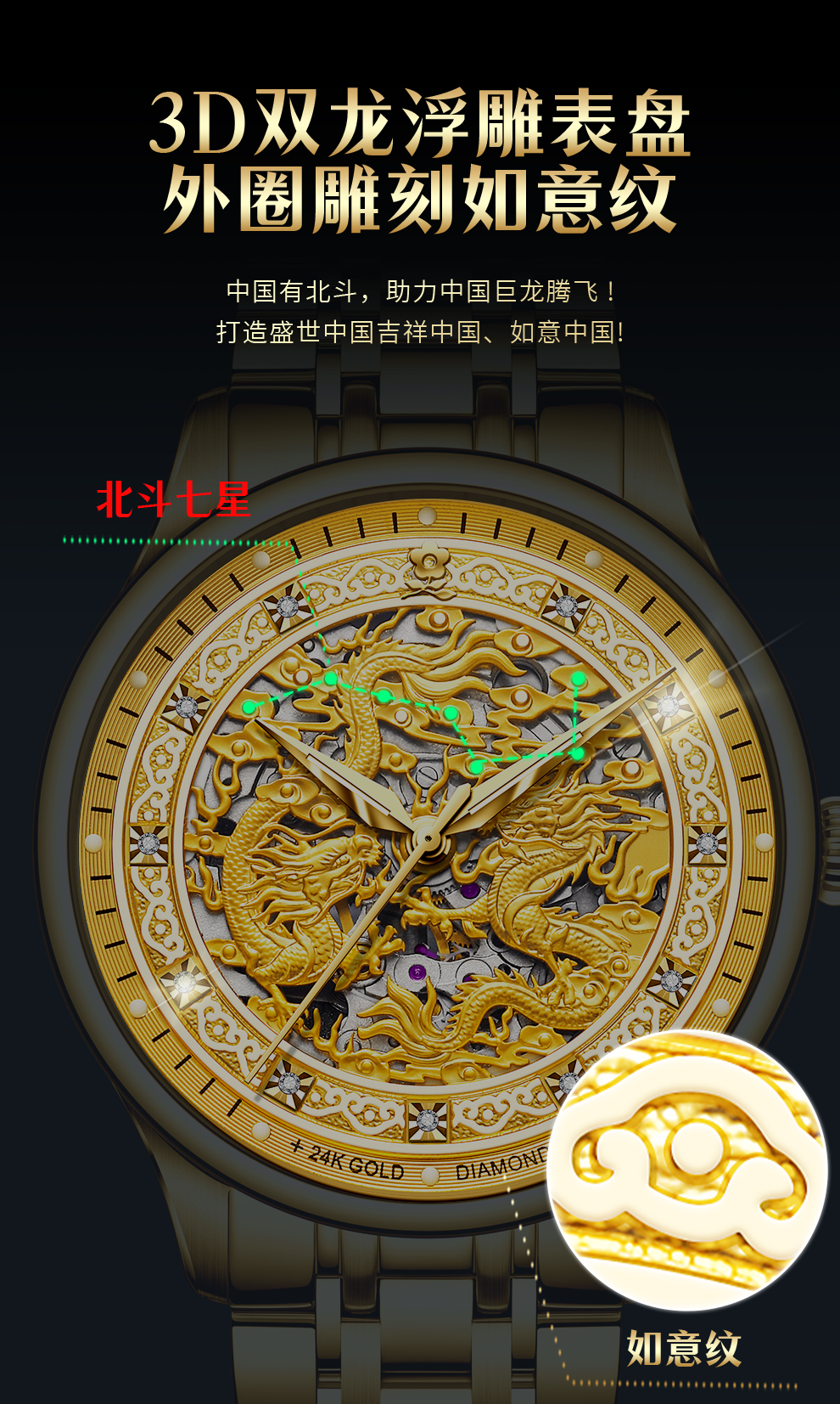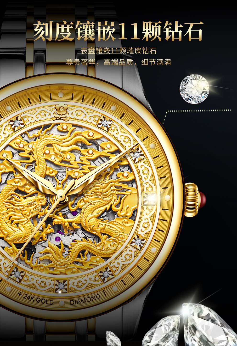 香港金六福KSF&法国梦特娇联名款-盛世飞龙 真金真钻 夜光全自动机芯 男士商务金表