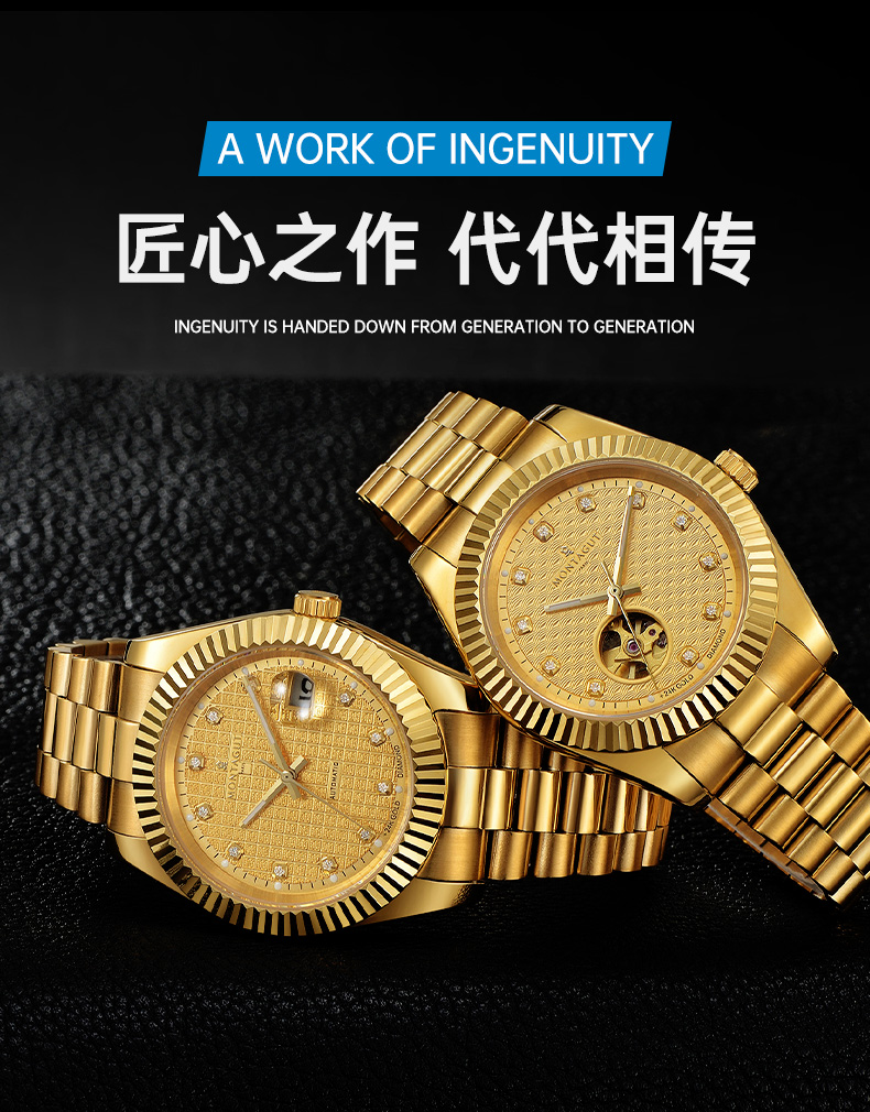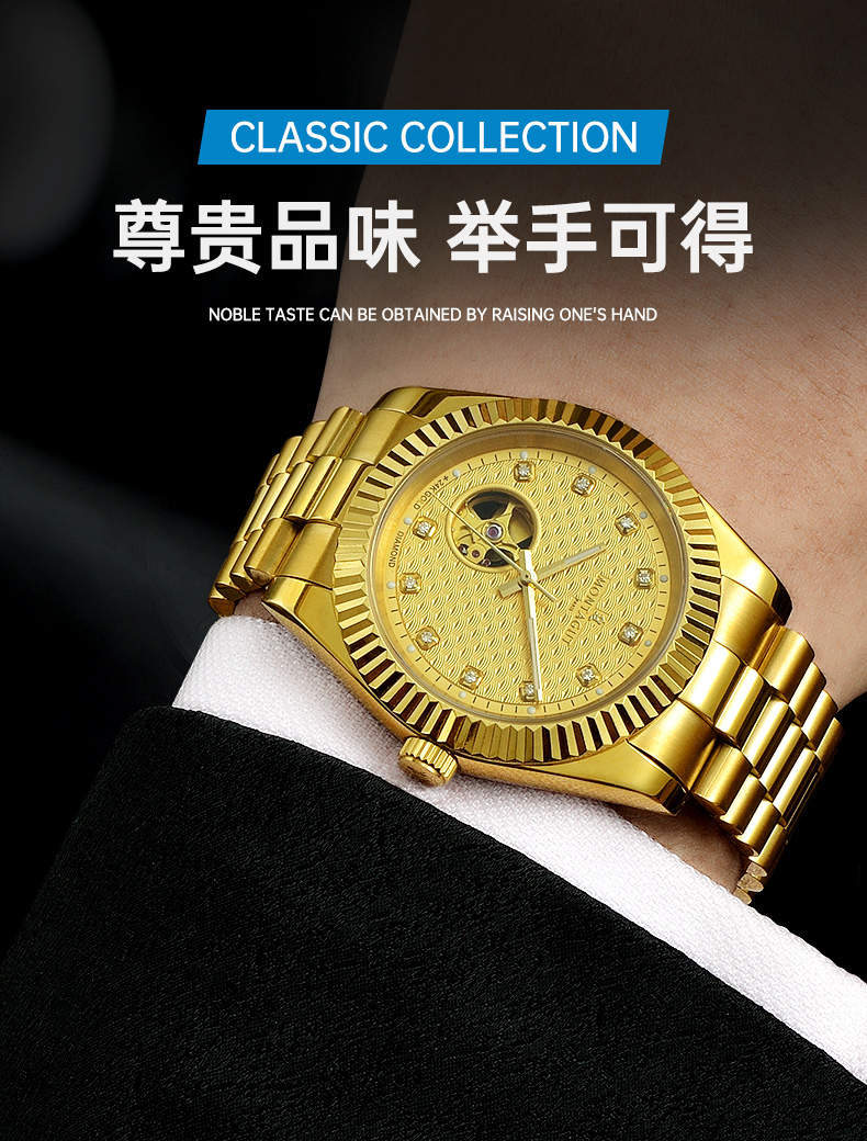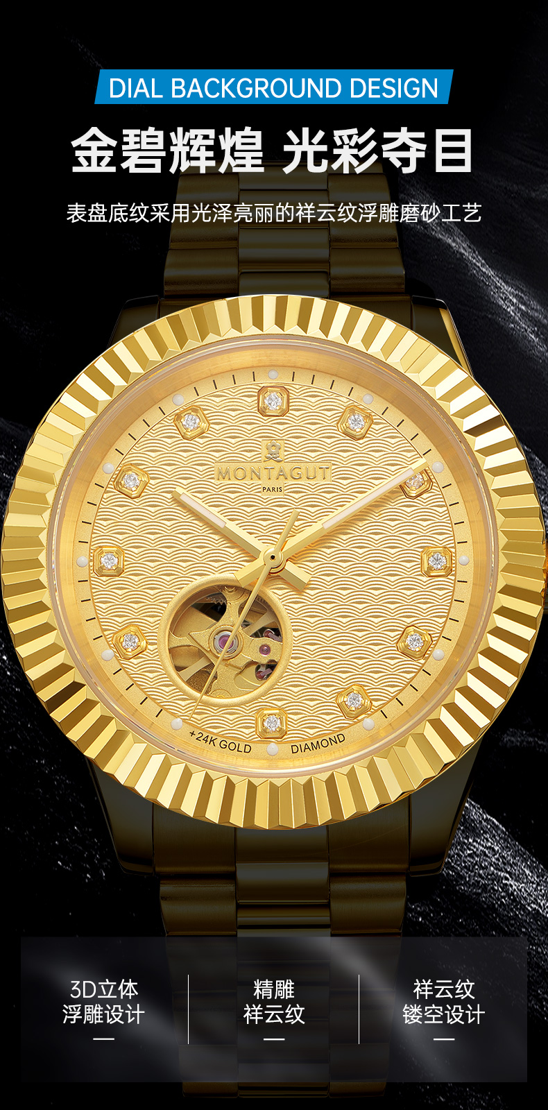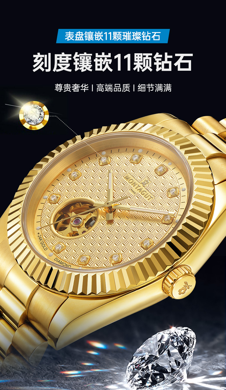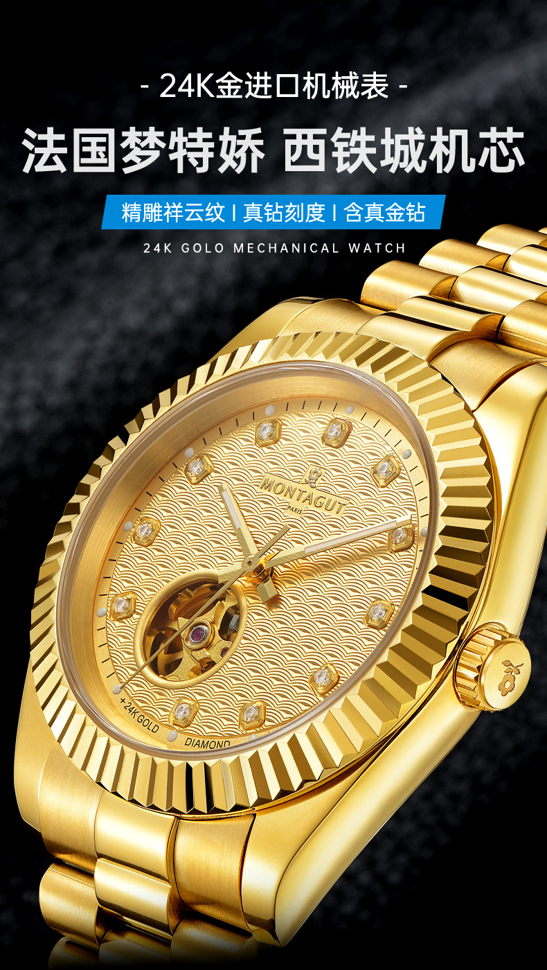 香港金六福KSF&法国梦特娇联名款-瑞气祥云 真金真钻 夜光全自动机芯 男士商务金表