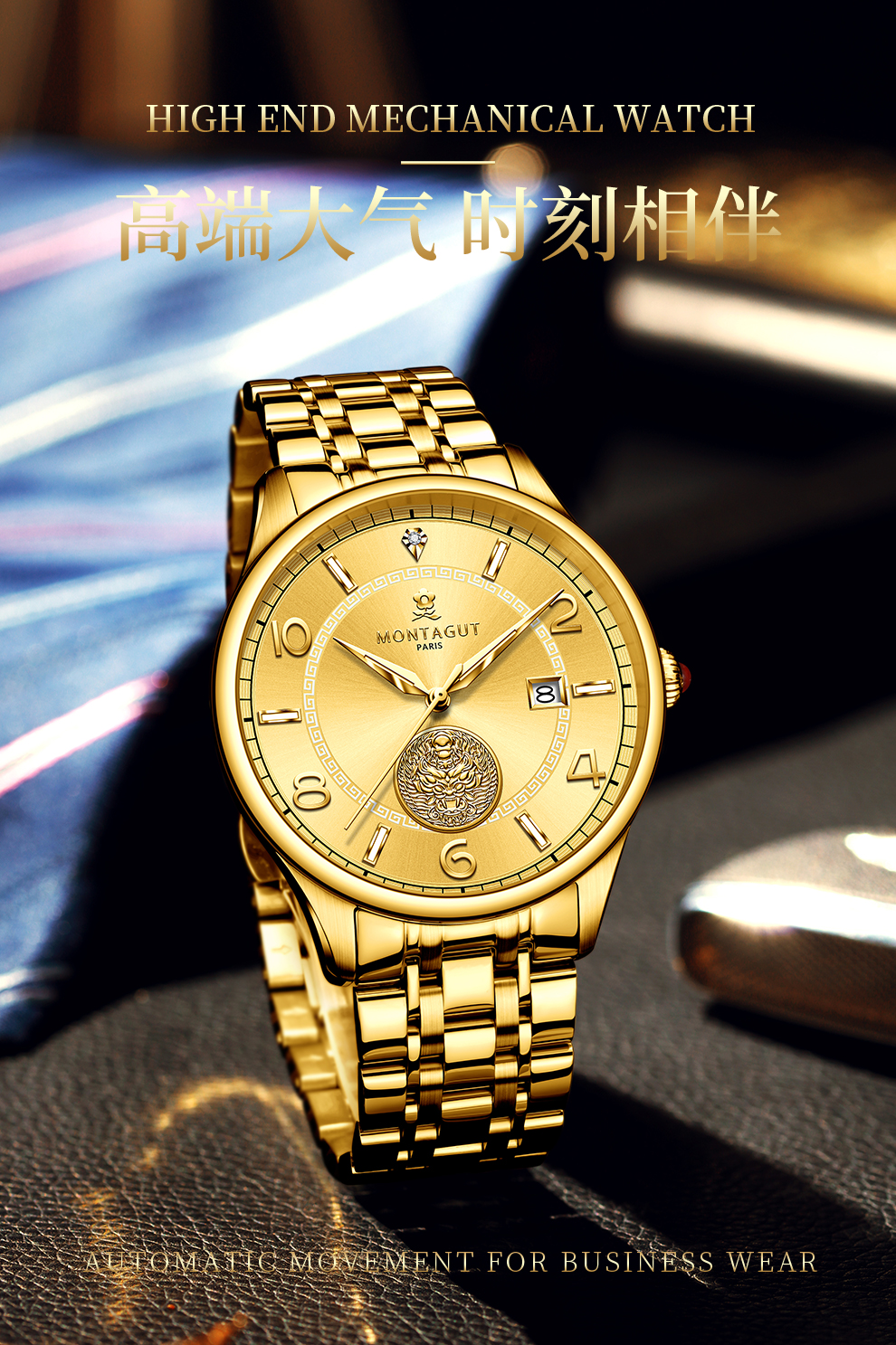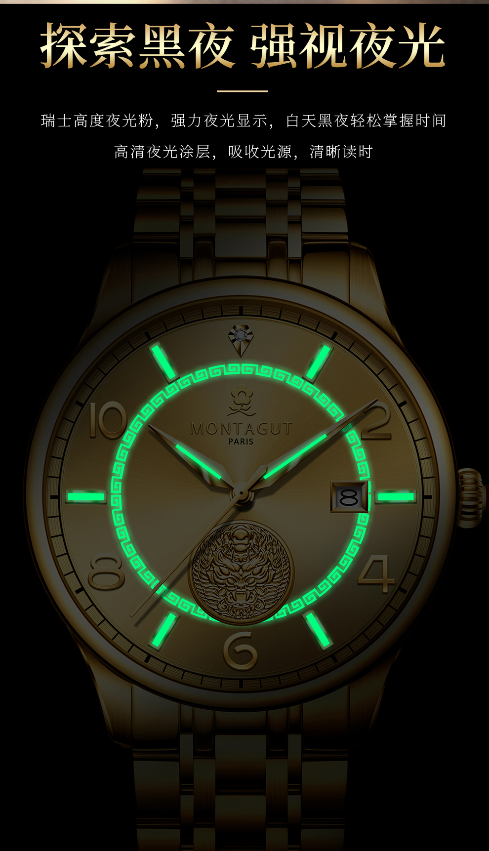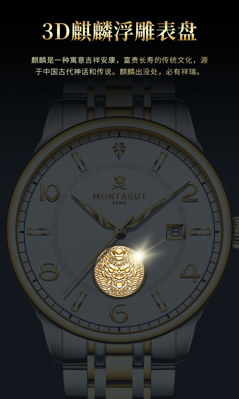 香港金六福KSF&法国梦特娇联名款-祥瑞麒麟 真金真钻 夜光全自动机芯 男士商务金表