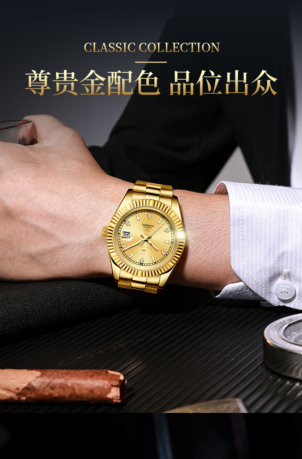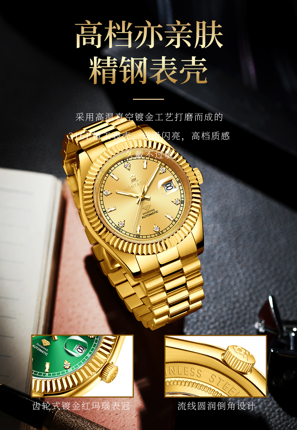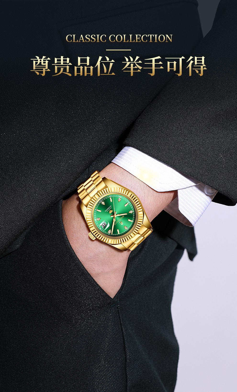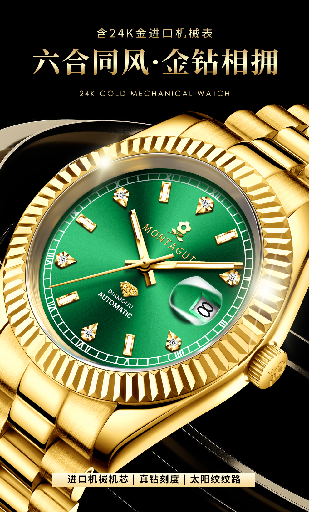 香港金六福KSF&法国梦特娇联名款-六合同风 真金真钻 夜光全自动机芯 男士商务金表(表盘绿)