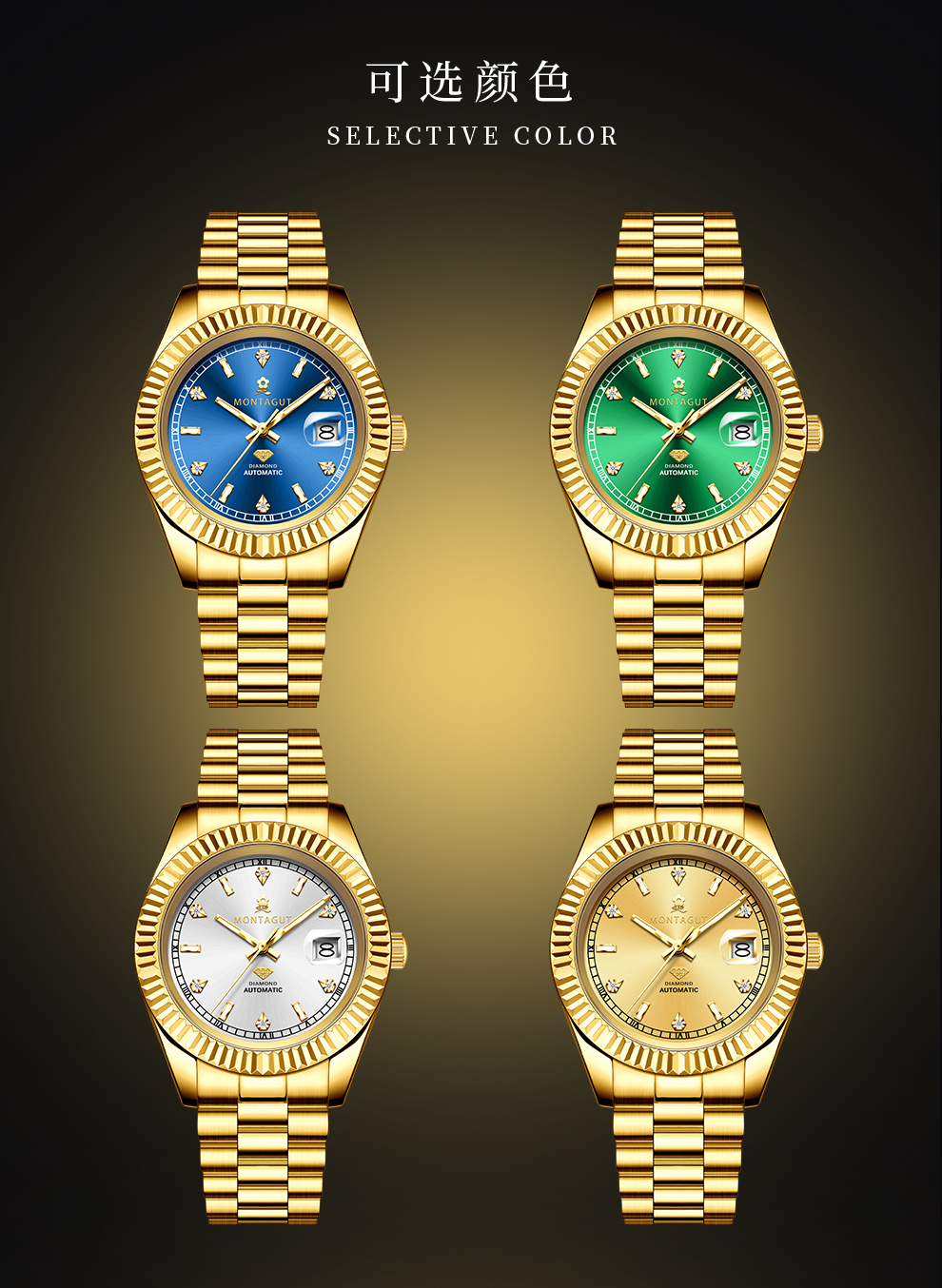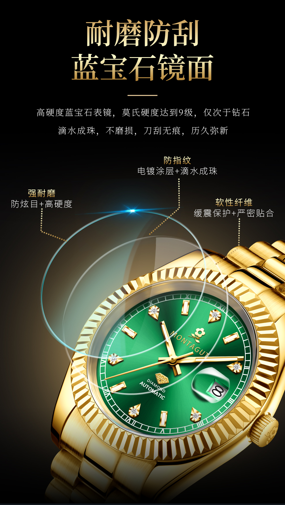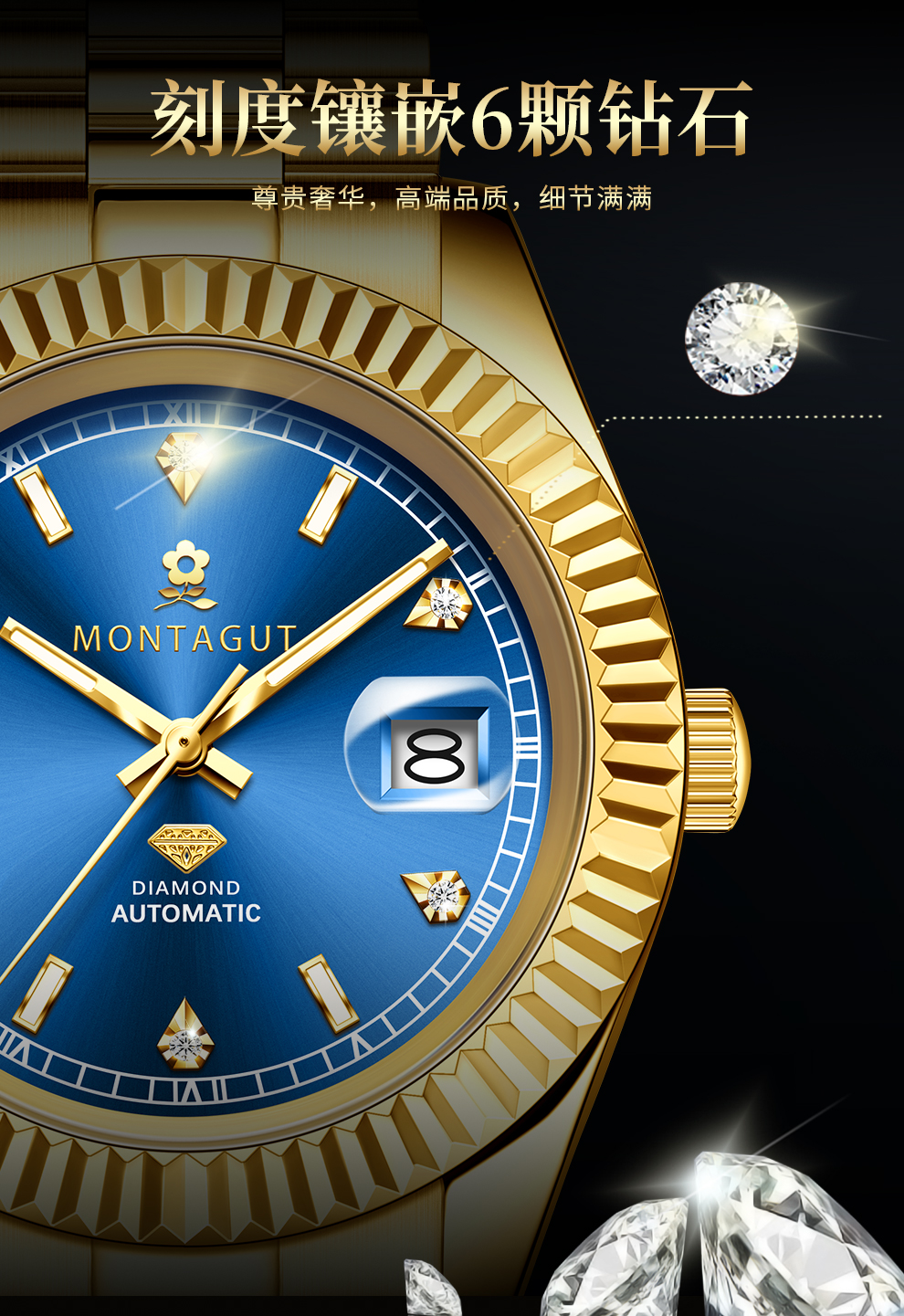 香港金六福KSF&法国梦特娇联名款-六合同风 真金真钻 夜光全自动机芯 男士商务金表(表盘绿)