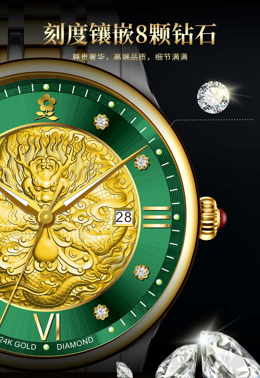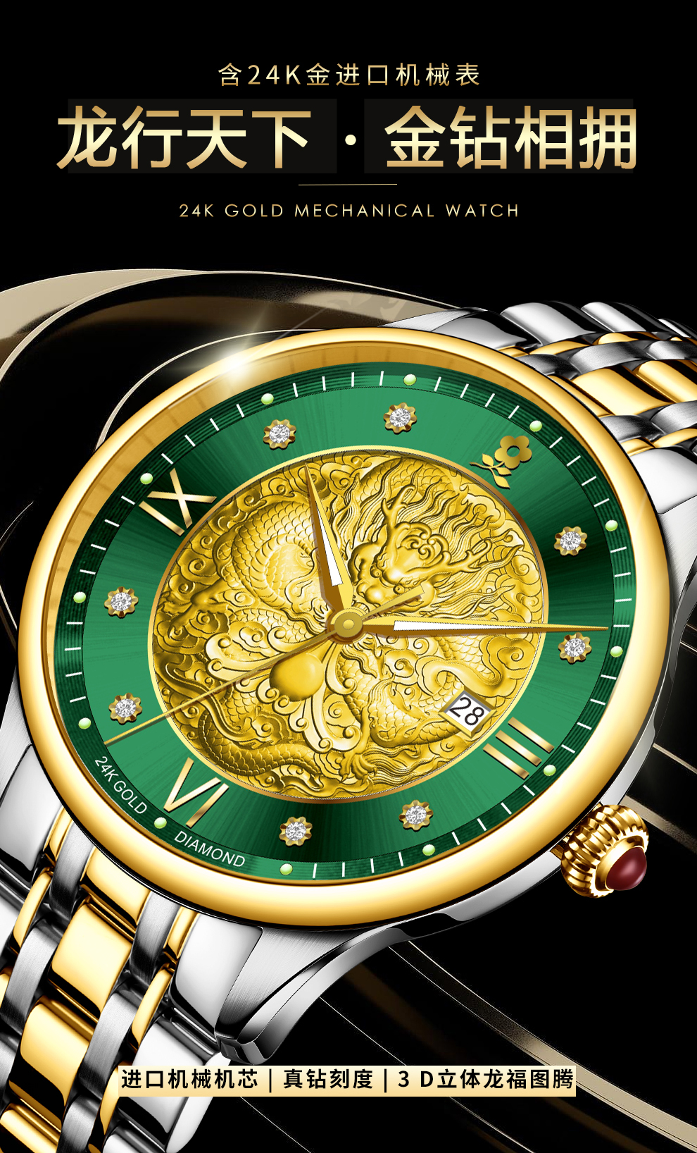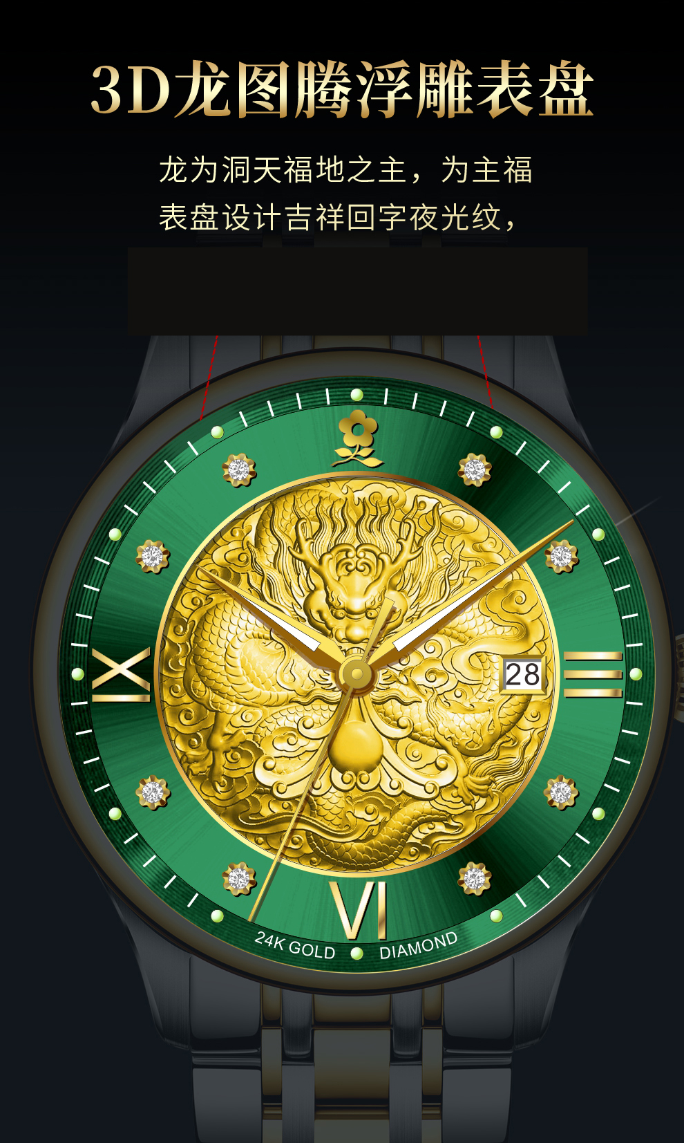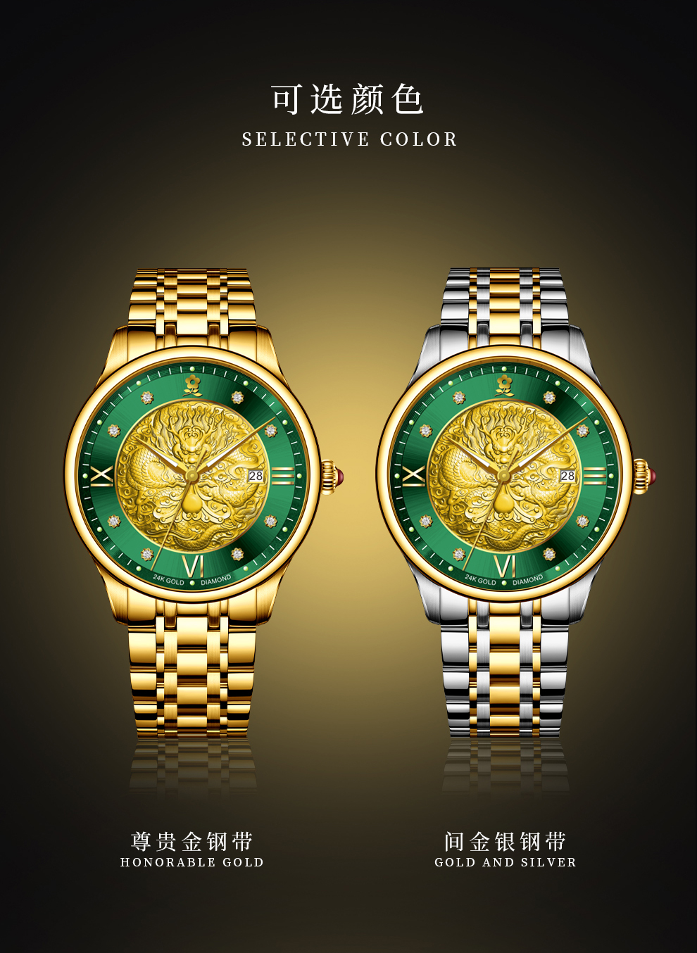 香港金六福KSF&法国梦特娇联名款-龙行天下 真金真钻 夜光全自动机芯 男士士商务金表(金)